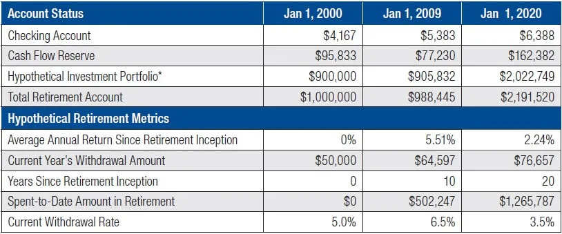 Let’s return to the hypothetical retirement that began on January 1, 2000. At that time, the retiree chose to spend $50,000 per year and indexed to inflation. The following table illustrates the values of the hypothetical portfolio and the different allocations as they appeared on January 1 of the first, 10th, and 20th year of retirement.