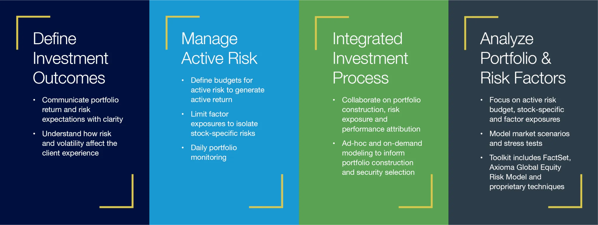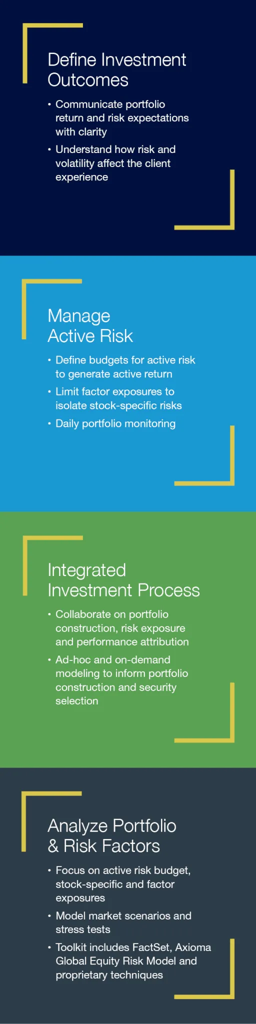 Within our portfolios, risk is managed through a combination of qualitative portfolio manager peer review and quantitative techniques, providing robust data on factor exposures, credit, interest rates and volatility metrics. Investment risk is analyzed through intensive, bottom-up fundamental analysis and valuation for individual investments.