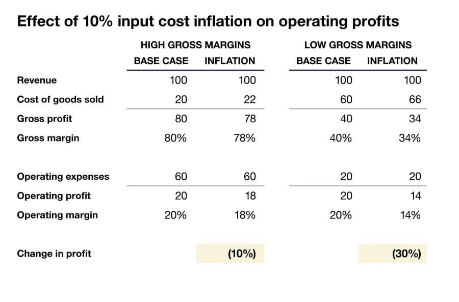 High gross margins are closely related to pricing power. Gross margins measure the markup on the cost of goods or services. A company with high margins will be less affected by a rise in input costs because they are less material to overall profitability (see table below). In general, companies that have highly variable cost structures with low margins and returns to scale will suffer more from inflation. For example, labor-intensive companies will have to raise wages, which will offset any incremental revenue from higher prices, so at best they can keep margins steady. Conversely, companies with high margins, largely fixed cost structures, and large economies of scale—such as technology, software, and payments companies—will enjoy the benefit of inflation adding to the top line without a commensurate rise in costs.
