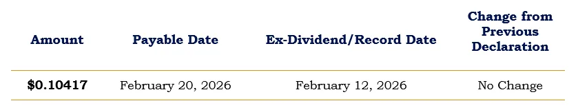Distribution rates are not performance and are calculated by summing the Trust’s monthly distribution per share over four quarters and dividing by the net asset value or market price per share, as applicable, as of the distribution announcement date. Distributions on common shares are generally paid from net investment income (regular interest and dividends) and may also include capital gains and/or a return of capital. The Trust’s distribution payable on February 20, 2026, includes a short-term capital gain but does not include a long-term capital gain or a return of capital. The specific tax characteristics of the distributions will be reported to the Trust’s common shareholders on Form 1099 after the end of the 2026 calendar year. The final determination for all distributions paid in 2026 will be made in early 2027 and reported to you on Form 1099-DIV. You should not use this notice as a substitute for your 1099-DIV.